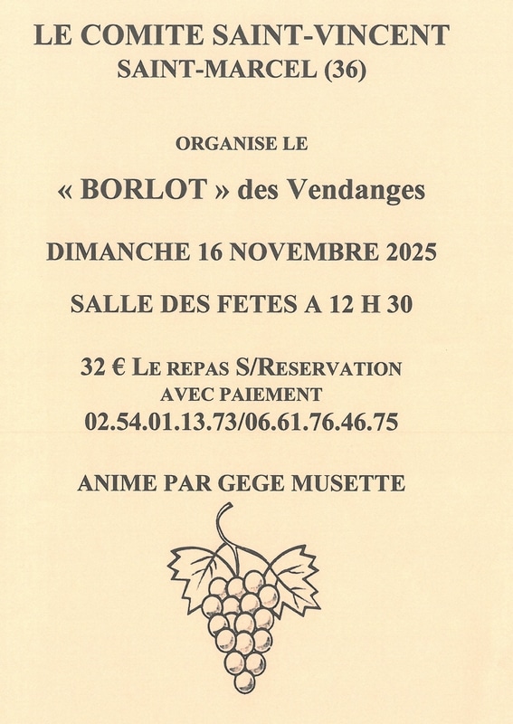 Voir l'itinéraireLe comité Saint-Vincent de Saint-Marcel organise le "Borlot des Vendanges", animé par Gégé Musette, repas sur réservation.
