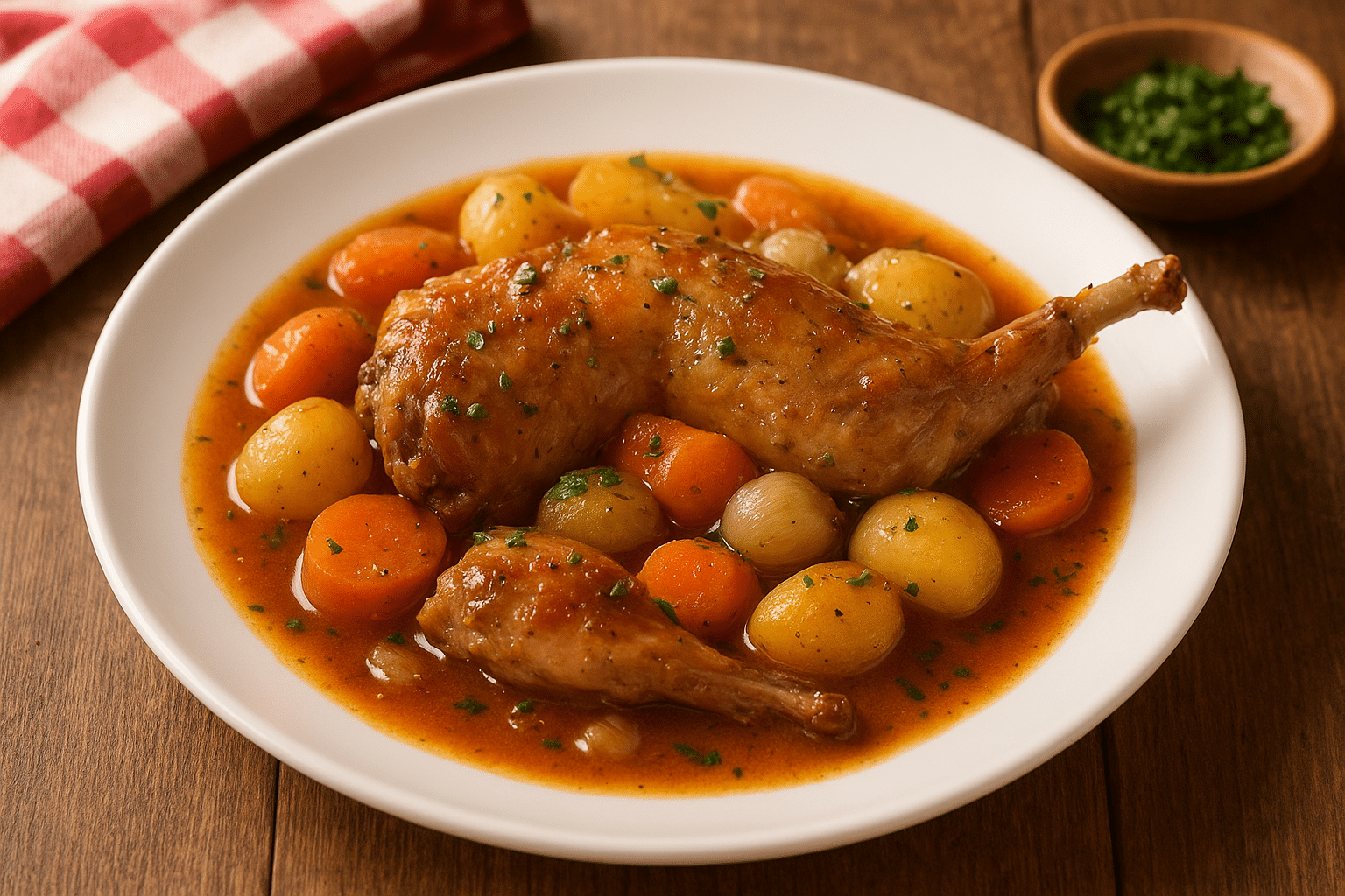 Dans une poêle, faites revenir dans le restant de beurre les foies coupés en deux et le lard détaillé en lardons. Ajoutez-les dans la cocotte et laissez la cuisson se poursuivre 20 minutes.